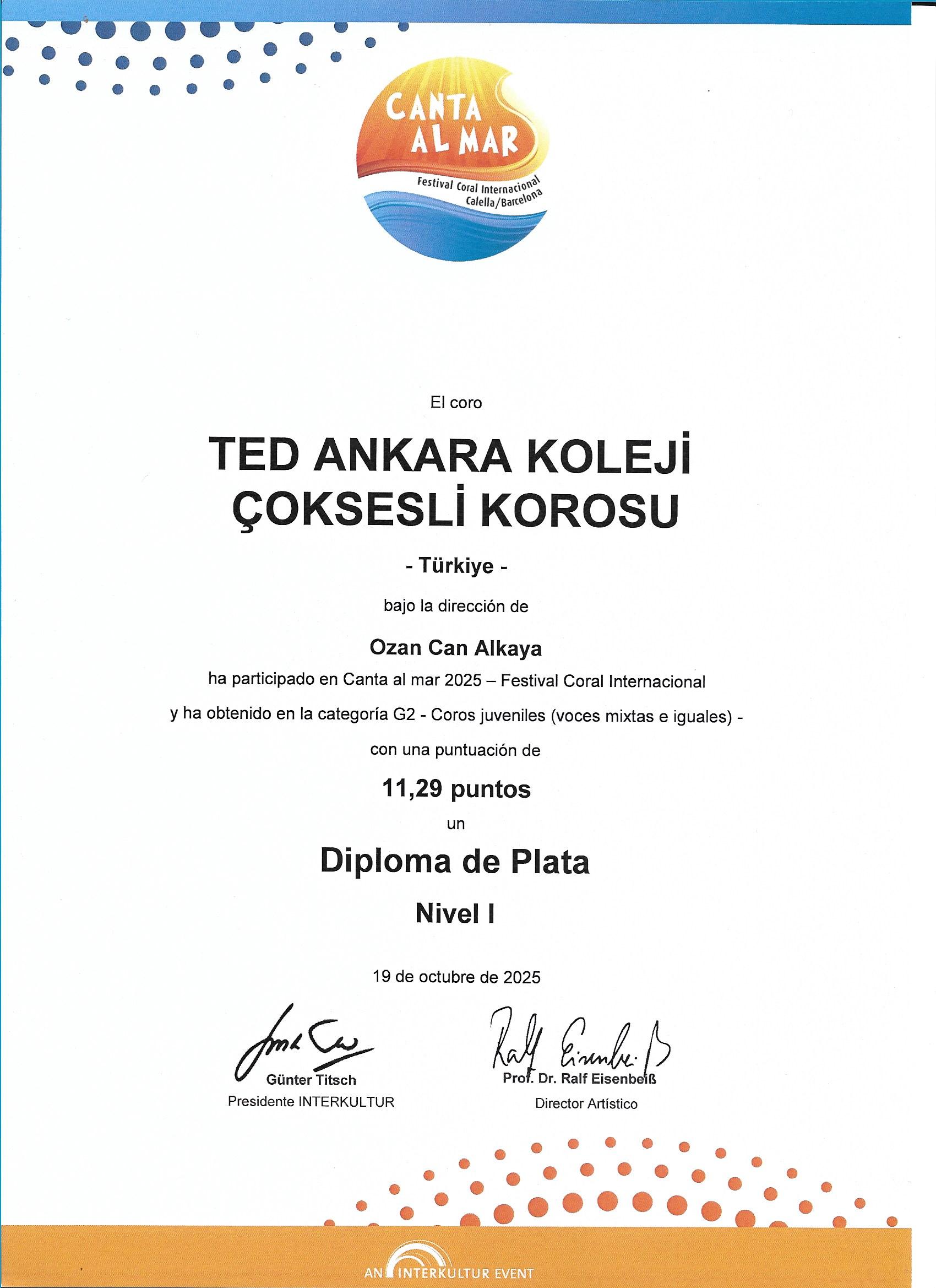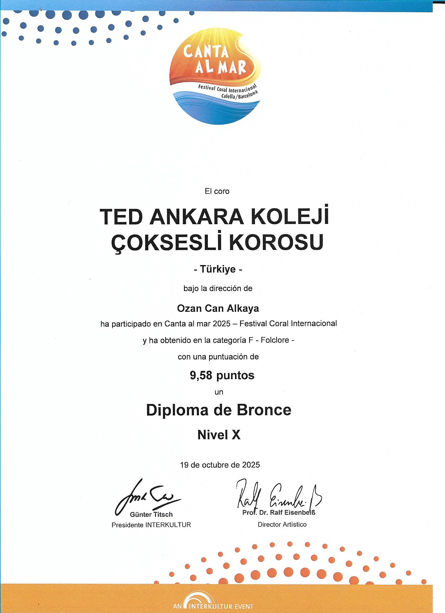 TED Ankara Koleji Çok Sesli Korosu,şef Ozan Can Alkaya yönetiminde 16–20 Ekim 2025 tarihleri arasında İspanya’nın Barselona/Calella kentinde düzenlenen Uluslararası Canta Al Mar Korolar Festivali’ne katılarak ülkemizi başarıyla temsil etti.