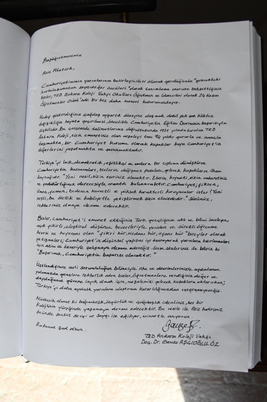 Hedef gösterdiğiniz çağdaş uygarlık düzeyine ulaşmak dahil pek çok kökten değişikliğin hayata geçirilmesi, öncelikle Cumhuriyetin Eğitim Devriminin başarısıyla ilişkilidir. Bu çerçevede talimatlarınız doğrultusunda 1931 yılında kurulan TED Ankara Koleji, sizin emanetiniz olan meşaleyi tam 94 yıldır gururla ve inançla taşımakta, bir Cumhuriyet kurumu olarak kuşaklar boyu Cumhuriyet’in değerlerini yaşatmakta ve savunmaktadır.