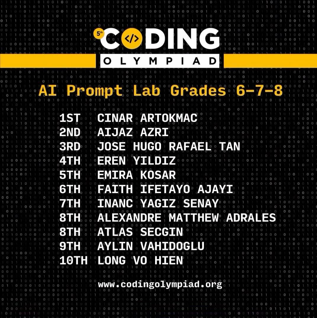 15 Kasım 2025 tarihinde gerçekleştirilen yarışmada; verilen süre içerisinde doğru, açık ve etkili İngilizce yapay zeka istemleri (prompt) oluşturarak, yapay zeka teknolojisini başarıyla kullanan öğrencilerimiz bizleri gururlandırdılar. Yarışmada, 6. sınıf öğrencimiz Eren Yıldız dünya dördüncüsü ve 7. sınıf öğrencimiz İnanç Yağız Şenay dünya yedincisi olma başarısı gösterdi.