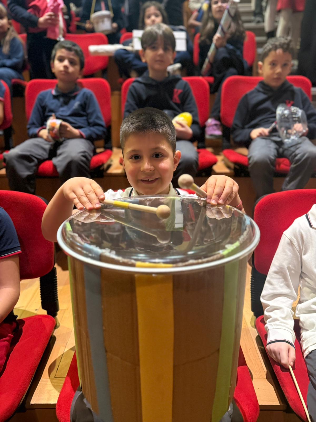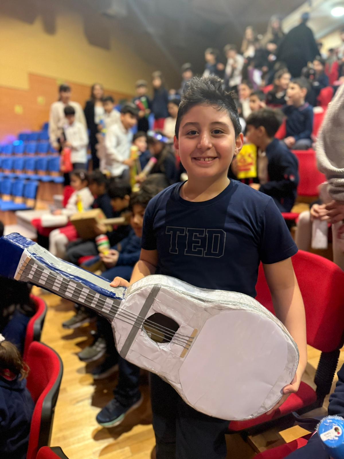 İlkokul 2. sınıf öğrencilerimiz, geri dönüşümün gücünü müziğin büyüsüyle buluşturan unutulmaz bir konser gerçekleştirdi. Atık malzemeleri hayal güçleriyle dönüştüren minik sanatçılar, kendi tasarladıkları çalgılarla sahneye çıkarak izleyenlere hem ritim hem de umut dolu bir görsel şölen sundu. Plastik şişelerden davullar, kutulardan gitarlar, kapaklardan ritim aletleri… Çocukların ellerinde sıradan atıklar, doğayı koruyan melodilere dönüştü. Sahnedeki her nota çevre bilincinin ve yaratıcılığın güçlü bir mesajını taşıdı.